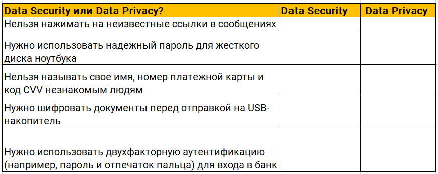 Если вы везде ответили «data privacy» вы тоже не ошиблись. Да, все сложно.