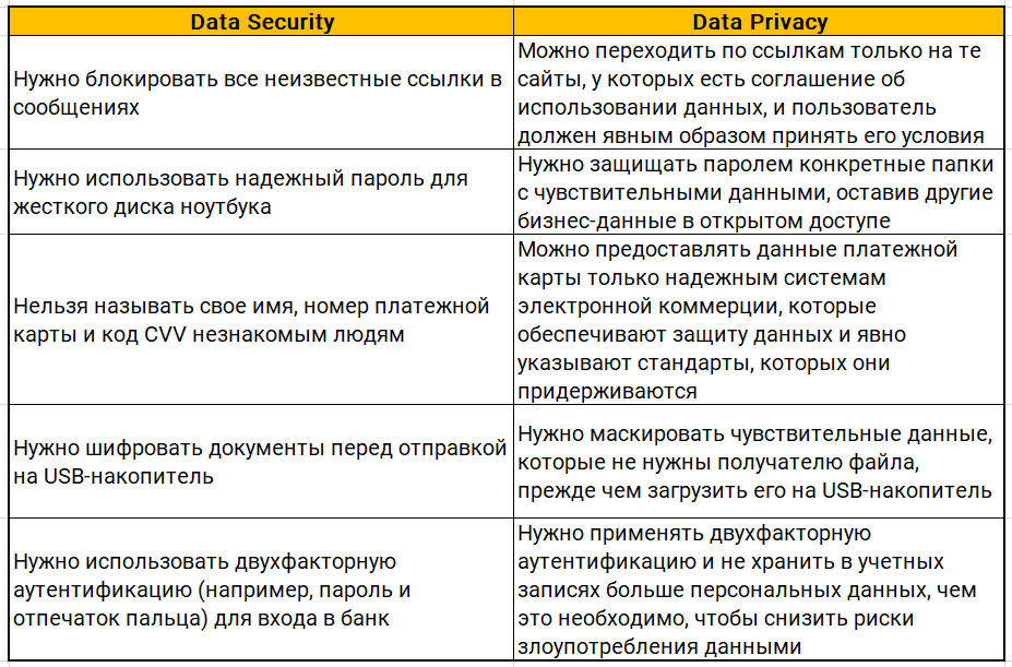 Вспомните о нашем опросе. Давайте вернемся к нему и сравним рекомендации по защите данных с мерами по соблюдению Data Privacy. Попробуем понять контекст использования данных, от которого зависит метод обеспечения их конфиденциальности.