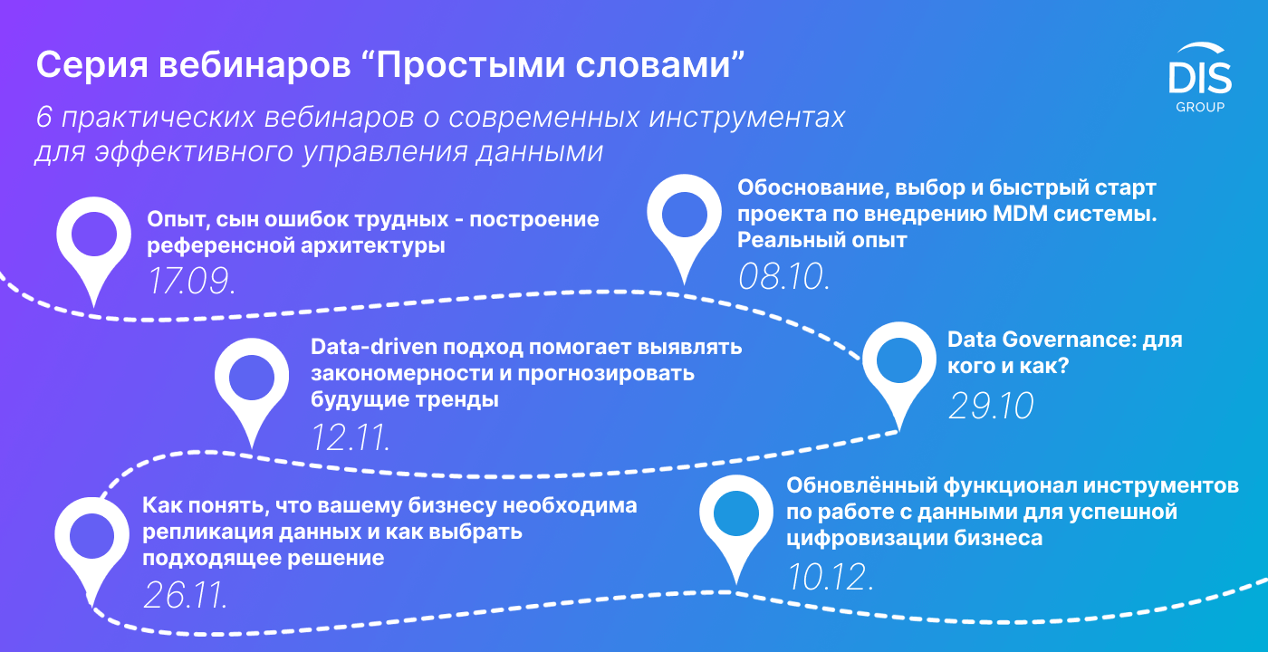 Серия вебинаров «Простыми словами» включает в себя 6 практических вебинаров о современных инструментах для эффективного управления данными. Все вебинары серии объединены одной целью – рассказать простыми словами о сложных решениях для цифровизации бизнеса.